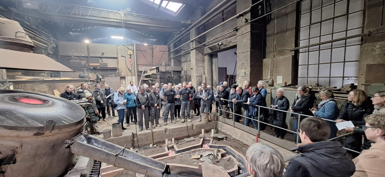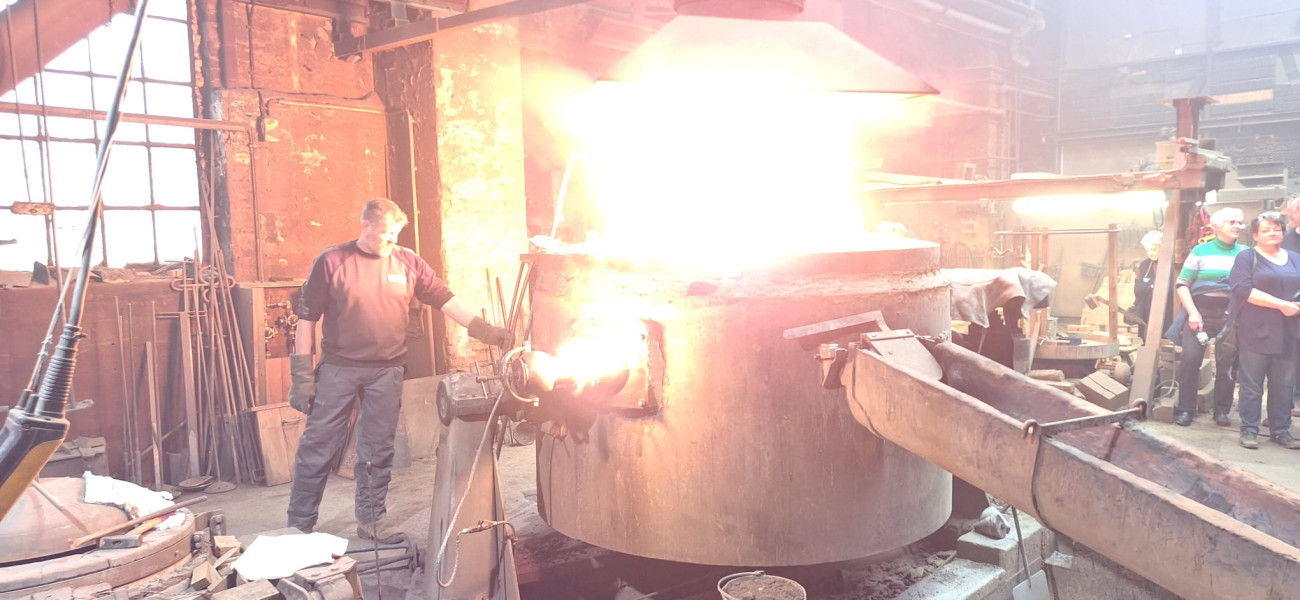 In der Gießerei angekommen, wurden die Gemeindemitglieder von dem beeindruckenden Brennofen und dem handwerklichen Können der Glockengießer empfangen. Die Glocken wurden dabei nach den traditionellen Arbeitsschritten der letzten 1000 Jahre gegossen, die sich auch in Schillers Ballade „Das Lied von der Glocke“ finden lassen: Schillers Anfangsverse „Fest gemauert in der Erden steht die Form aus Lehm gebrannt. Heute muss die Glocke werden. Frisch Gesellen, seid zur Hand“ erlebten die Anwesenden vor Ort aufs Neue. Glockengießermeister Rincker erklärte den Anwesenden den Prozess und die Kunst des Glockengießens samt aller dafür notwendigen und teils Monate andauernder Vorarbeiten. „Es ist eine Ehre, diese Tradition fortzuführen“, sagte der Glockengießer in 13. Generation seines Familienunternehmens, während seine Mitarbeiter versuchten, den Ofen auf die erforderliche Temperatur von circa 1060 Grad zu bringen. Aufgrund des an diesem Tag vorherrschenden Tiefdrucks zog sich dies circa zwei Stunden länger als ursprünglich geplant hin. Der guten Stimmung vor Ort tat dies keinen Abbruch. Und auch der Posaunenchor überbrückte die Wartezeit mit festlichen Chorälen.